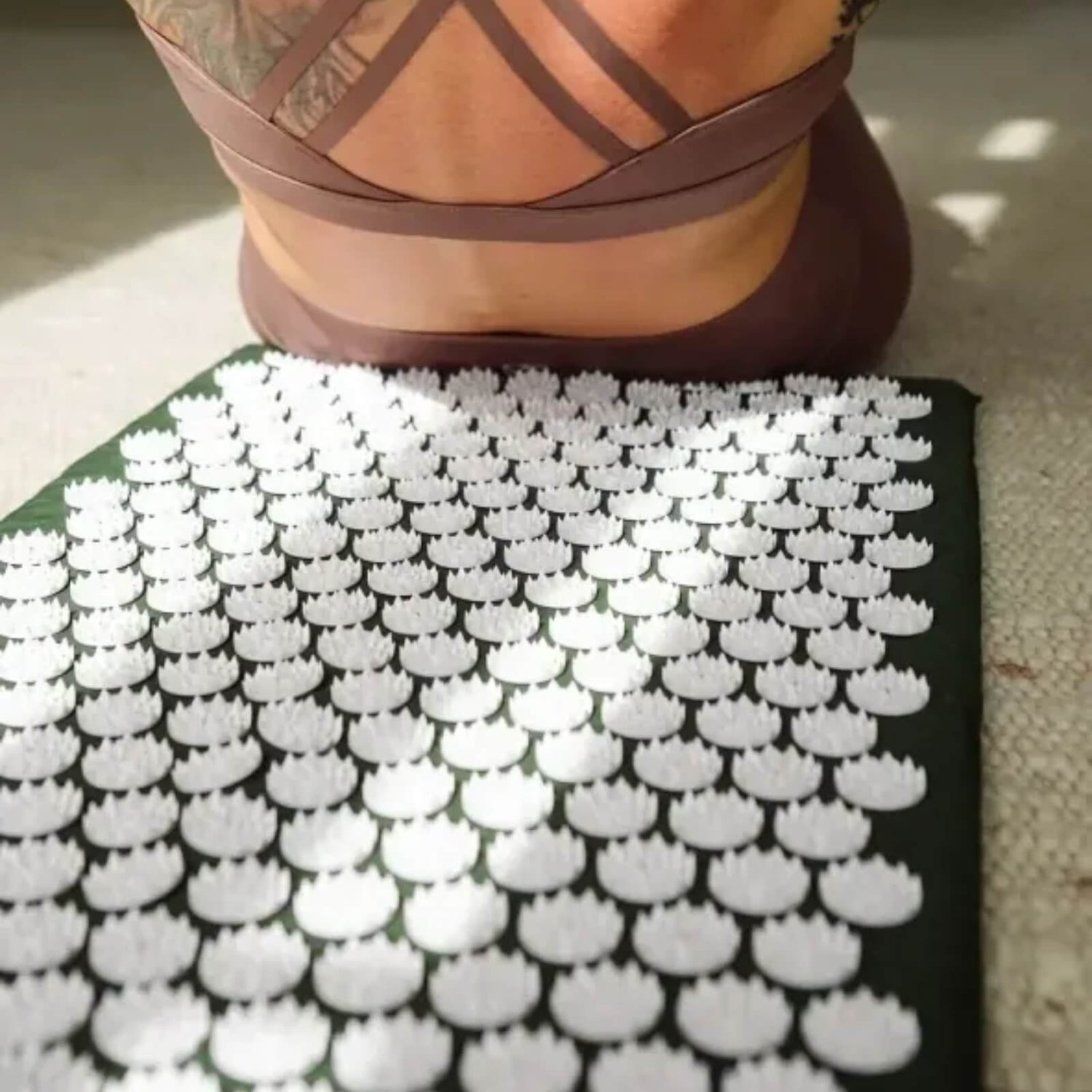 Sit or lie down slowly so your body adjusts to the pressure points. Beginners can wear a shirt or place a thin cloth over the mat.